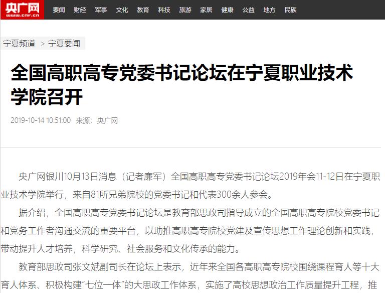 央广网银川10月13日消息(记者廉军)全国高职高专党委书记论坛2019年会11-12日在宁夏职业技术学院举行,来自81所兄弟院校的党委书记和代表300余人参会。