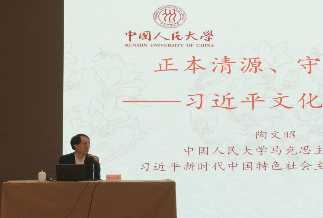 中国人民大学马克思主义学院副院长、习近平新时代中国特色社会主义思想研究院副院长,国家万人计划哲学社会科学领军人才陶文昭教授,到会作题为《正本清源、守正创新——习近平文化思想概要》的主旨报告。陶文昭教授从习近平文化思想的理论渊源、形成过程、基本内涵和理论地位四个方面向论坛全面做了讲解。报告强调,习近平文化思想博大精深,不仅有深邃的观点、战略的谋划、科学的部署,还教给我们正确的立场、管用的方法。要全面学习领会,既准确理解其中的重要概念和提法,又加强系统性、整体性把握,吃透基本精神,领会核心要义,明确实践要求,做到学有所悟、融会贯通。要深入领会这一重要思想蕴含的重大创新观点、科学方法论和关于文化建设的战略部署,深刻认识这一重要思想是一个不断展开的、开放式的、科学系统的思想体系,必将随着实践深入不断丰富发展。学习贯彻习近平文化思想既要重学习、又要重实践,在深化理论武装上下功夫,在提高舆论引导能力上下功夫,在改进创新精神文明建设上下功夫,在促进文化繁荣上下功夫,在增强国际传播效能上下功夫,在防范化解意识形态风险上下功夫,切实把这一重要思想贯彻落实到宣传思想文化工作各方面和全过程。