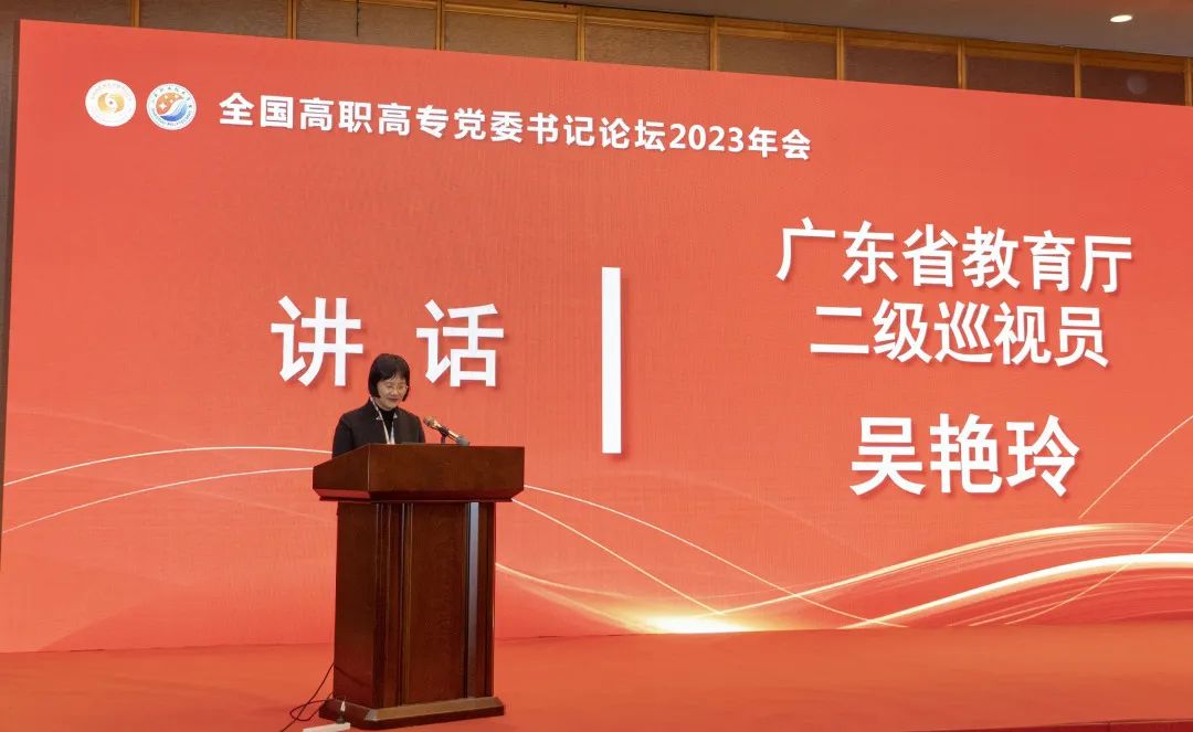 广东省教育厅二级巡视员吴艳玲到会致辞,她指出,高等职业教育是我国高等教育体系的重要组成部分,是培养高素质技术技能人才的重要途径。广东积极统筹职业教育、高等教育、继续教育协同创新,推进职普融通、产教融合、科教融汇,将同全国高职高专院校一道,深入贯彻党的教育方针,以高质量党建引领和推动思想政治工作高质量发展,持续办好高等职业教育,为全面建设社会主义现代化强国、实现第二个百年奋斗目标,以中国式现代化全面推进中华民族伟大复兴提供源源不断的高素质技能人才支持和高水平智力支持,为推动我国高等职业教育事业发展作出更大的贡献。