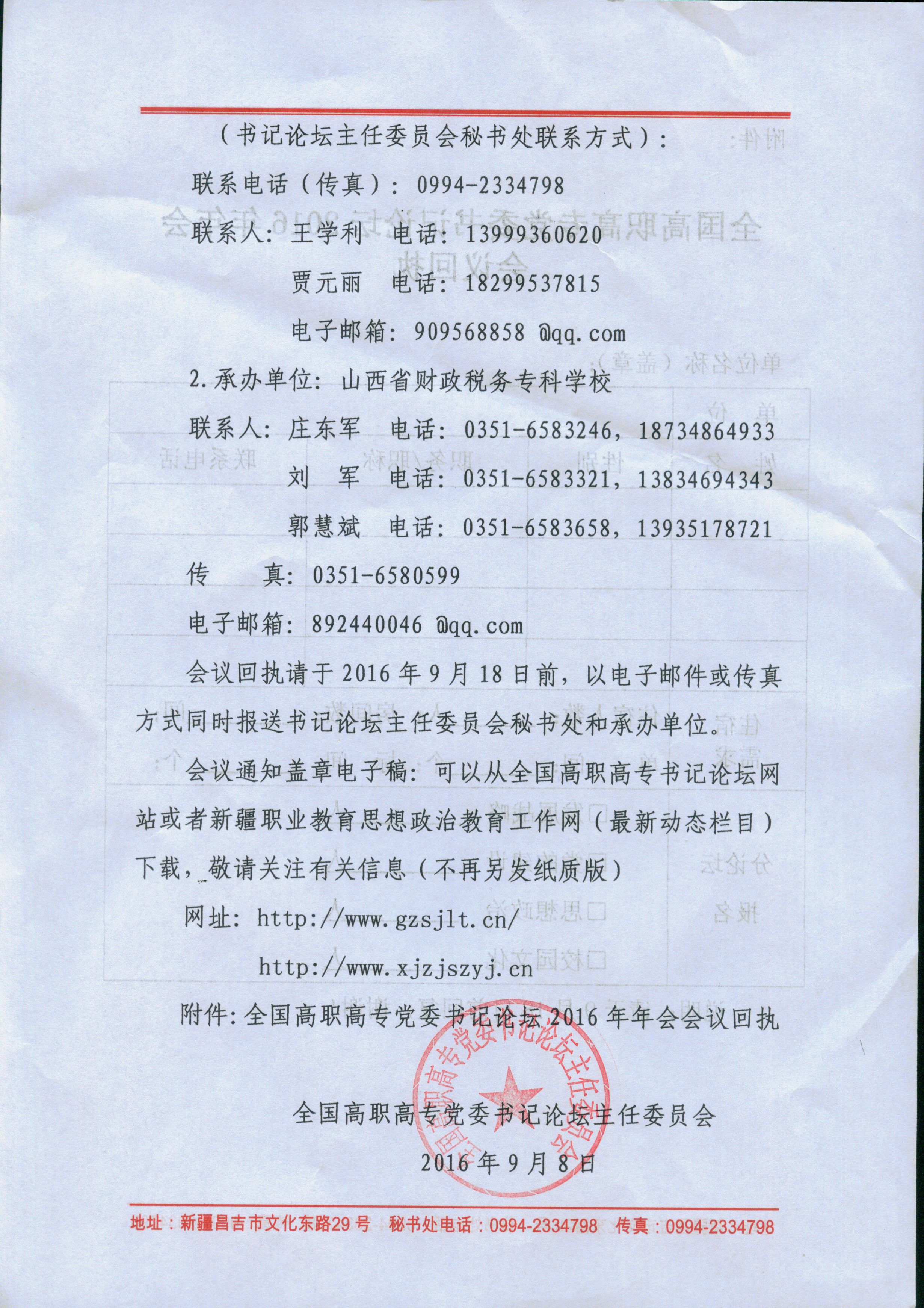 附件:全国高职高专党委书记论坛2016年年会会议回执(