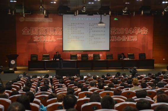 10月31日上午,中国人民大学马克思主义学院陶文昭教授应邀在全国高职高专党委书记论坛2014年会上做了“立德树人 培育和践行社会主义核心价值观”的主题学术报告。来自全国116所高职高专院校的221名党委书记、副书记,相关处室负责人认真聆听了报告。