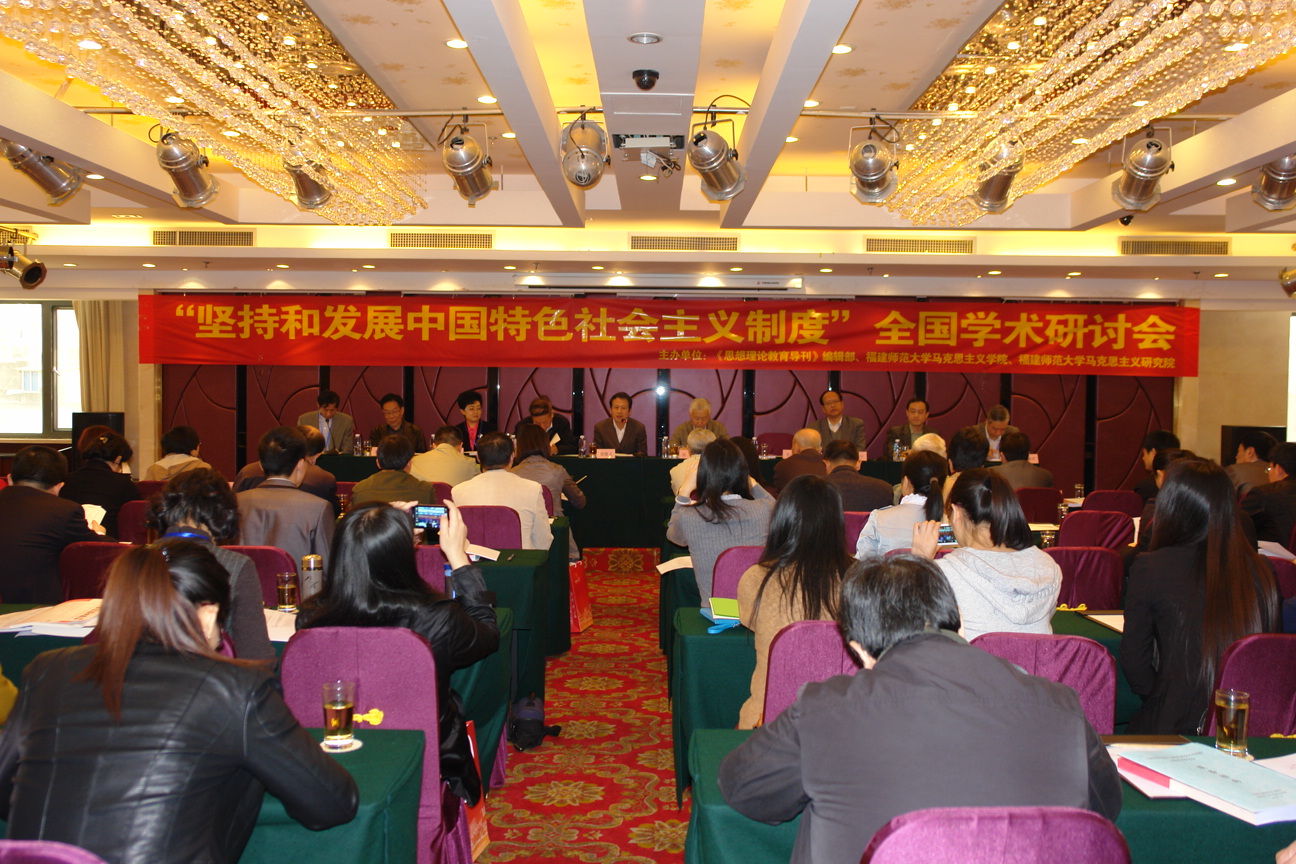 会议研讨阶段由刘书林教授主持。分别有来自全国的8位知名学者作主题发言:1、福州师范大学原校长李建平教授的发言作“坚持‘三个自信’必须深入批判新自由主义”的发言;2、北京大学原副校长梁柱教授的发言题目是:谈共和国两个30年的辩证统一关系;3、教育部高等学校社会科学发展研究中心主任、《高校理论战线》杂志社总编辑杨河教授作“坚持中国特色社会主义的道路自信、理论自信、制度自信”的发言;4、福建省政协社会与法制委员会主任、福建师范大学研究院副院长郑传芳教授的发言题目是“对中国特色社会主义制度自信的认识”;5、西南大学党委书记黄蓉生教授作了题为:对坚持和发展中国特色社会主义制度的几个理论问题的认识的发言;6、中国人民大学周新城教授作“中国特色的社会主义经济制度”的演讲;7《思想理论教育导刊》常务副主编刘书林教授作了“如何建设对中国特色社会主义自信”的发言;8、武汉大学梅荣政教授作了“完善中国特色社会主义制度的方法论思考”的发言。