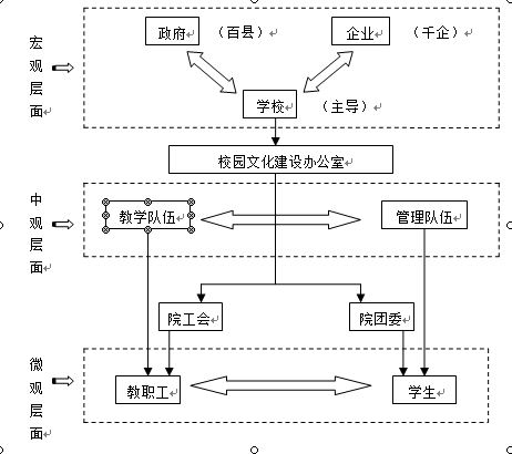 高职院校文化建设互动模式是学院五年来的研究与实践成果。在这一模式中,包括政府、企业与学校三个主体因素,学校是校园文化建设的主导因素,政府与企业是重要的协助因素。和谐互动文化模式有效地解决企业文化与校园文化的对接。