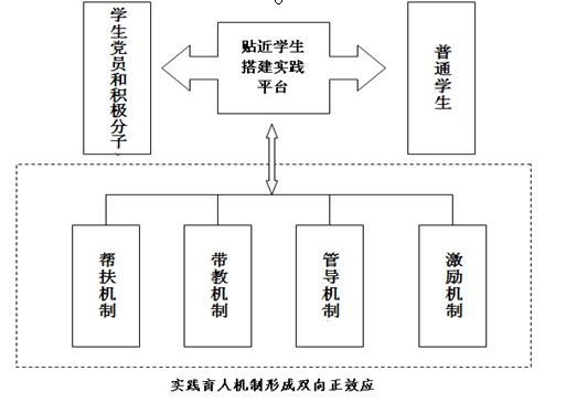 (一)帮扶机制。学校鼓励引导学生党员和入党积极分子以“一对一”结对形式,帮助某方面相对较弱的学生,消除困惑,平添自信。目的是树立群众观念,培养团队精神。比如,学生生活园区发起倡导的“大手牵小手、携手共成长”活动,得到了许多学生,特别是党员和积极分子的自觉响应。一批学有余力、自愿奉献的学生党员和积极分子带头与学习困难的学生开展学习辅导,给予家庭条件较困难的学生关心照顾,为遇到挫折情绪低落和缺乏自信的学生做好心理排解、传递正激励。这项活动开展五年来形成了特色,受到师生的支持和好评,曾获得学校文明特色创建项目等荣誉。